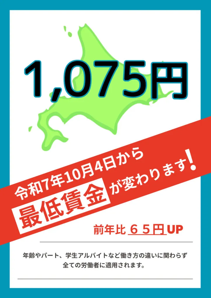 協同組合労務厚生事業協会のお知らせ 2025.09.11 最低賃金改正のお知らせ 最低賃金の改定が令和7年10月4日より改正されることが決定しました。 北海道の最低賃金は1,075円です。ご確認ください。