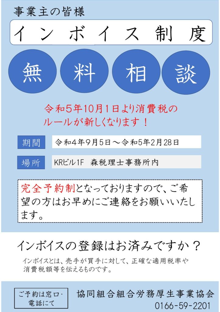 「インボイスの制度自体がわからない」、「インボイスに登録した方がいいのかわからない」など心配な方は、当組合の無料相談窓口で相談されてみてはいかがでしょうか。相談は予約制となっていますので、当組合の窓口にて予約受付をお願いします。