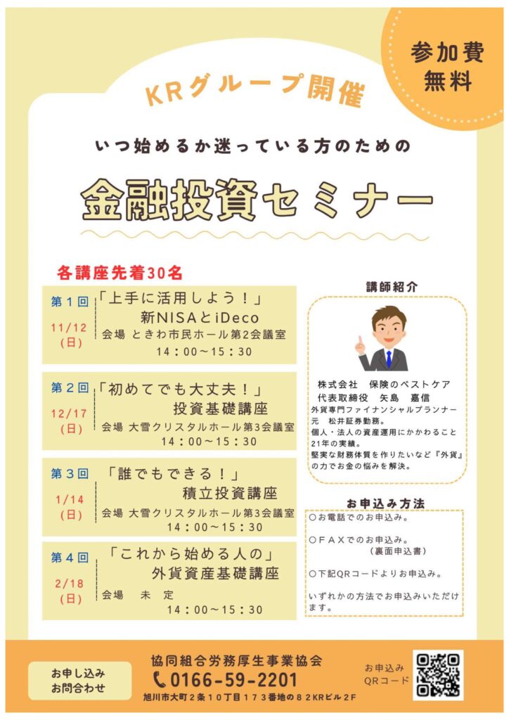 投資してみたいけど、損もしたくない、NISAとかiDecoよく聞くけど内容がよくわからない、今更始めるのも面倒くさい、でも老後も不安だしなぁ…ナドナド色々思っている方は多数いらっしゃることと思います。ですが!何事もまずは自分で動かないと始まりません、後でいいや!と思わずに、是非この機会に話を聞いてみませんか?