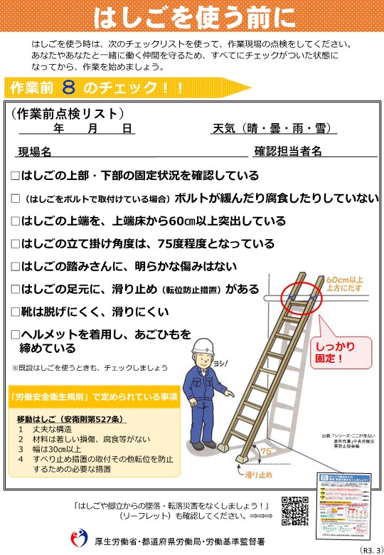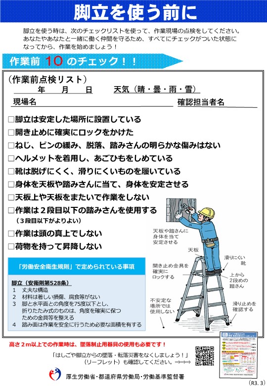 「脚立」や「はしご」から落ちる労災事故が多くみられます。現場に行く前、作業する前にチェックする習慣をお願いします。